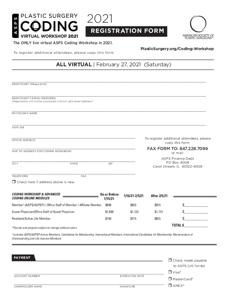 2021 REGISTRATION FORM The ONLY live virtual ASPS Coding Workshop in 2021. PlasticSurgery.org/CodingWorkshop To register additional attendees, please copy this form. ALL VIRTUAL February 27, 2021