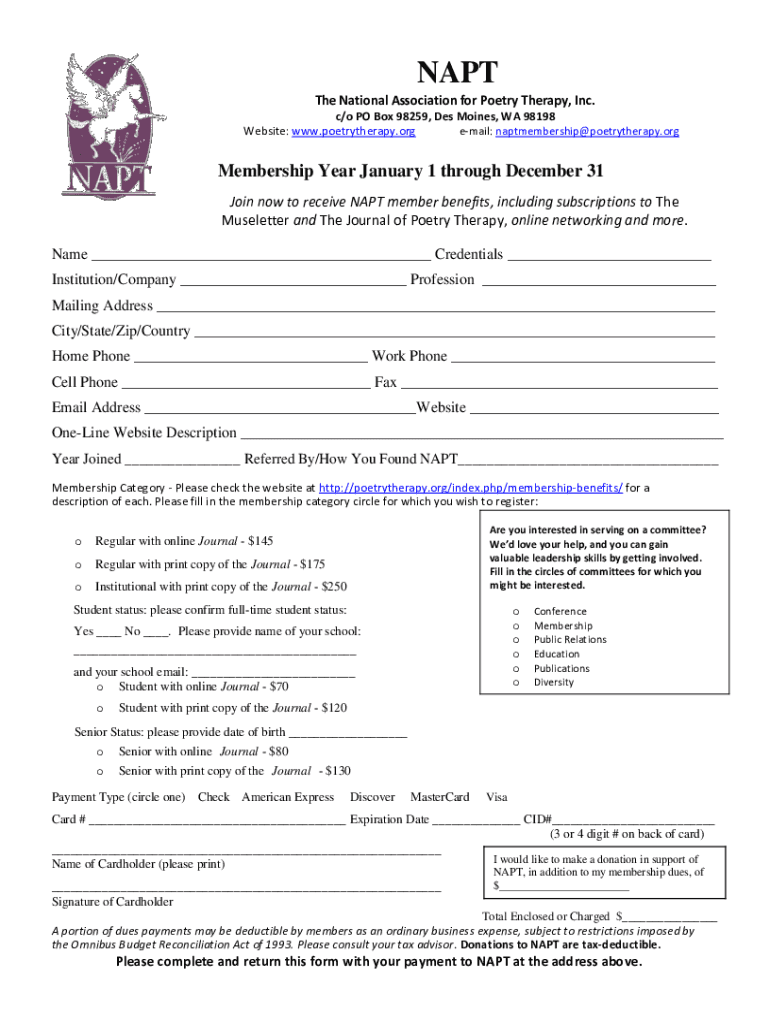 APT The National Association for Poetry Therapy, Inc. c/o PO Box 98259, Des Moines, WA 98198 Website: www.poetrytherapy.org email: naptmembership poetry therapy. Membership Year January 1 through