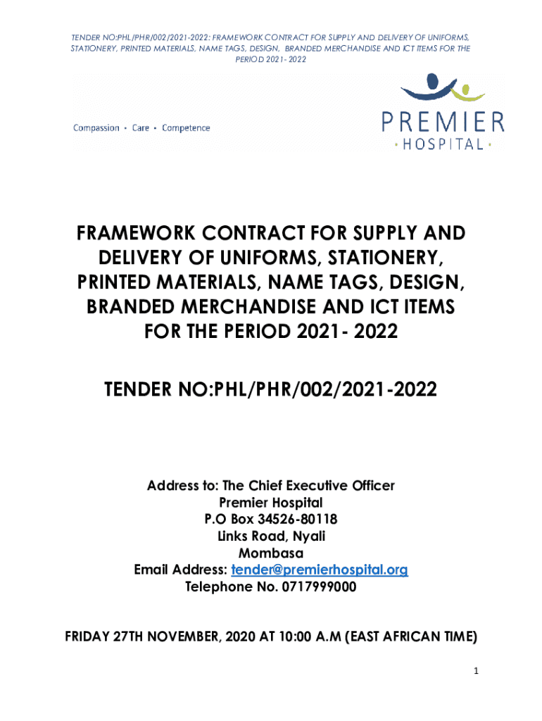 TENDER NO:PHL/PHR/002/20212022: FRAMEWORK CONTRACT FOR SUPPLY AND DELIVERY OF UNIFORMS,