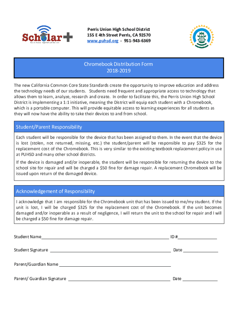 Ferris Union High School District 155 E 4th Street Ferris, CA 92570 www.puhsd.org 9519436369Chromebook Distribution Form 20182019 The new California Common Core State Standards create the opportunity
