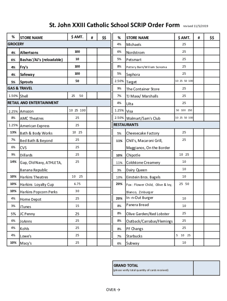 St. John XXIII Catholic School SCRIP Order Form STORE NAME GROCERY AMT.#revised 11/5/2019%STORE NAME AMT.4%Michaels254%Albertsons1006%Nordstrom256%Bashas '/AJ's (reloadable)105%Petsmart254%Fry 's1008%Pottery