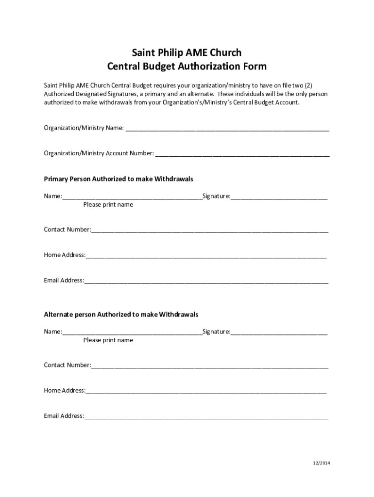 Saint Philip AME Church Central Budget Authorization Form Saint Philip AME Church Central Budget requires your organization/ministry to have on file two (2) Authorized Designated Signatures, a primary