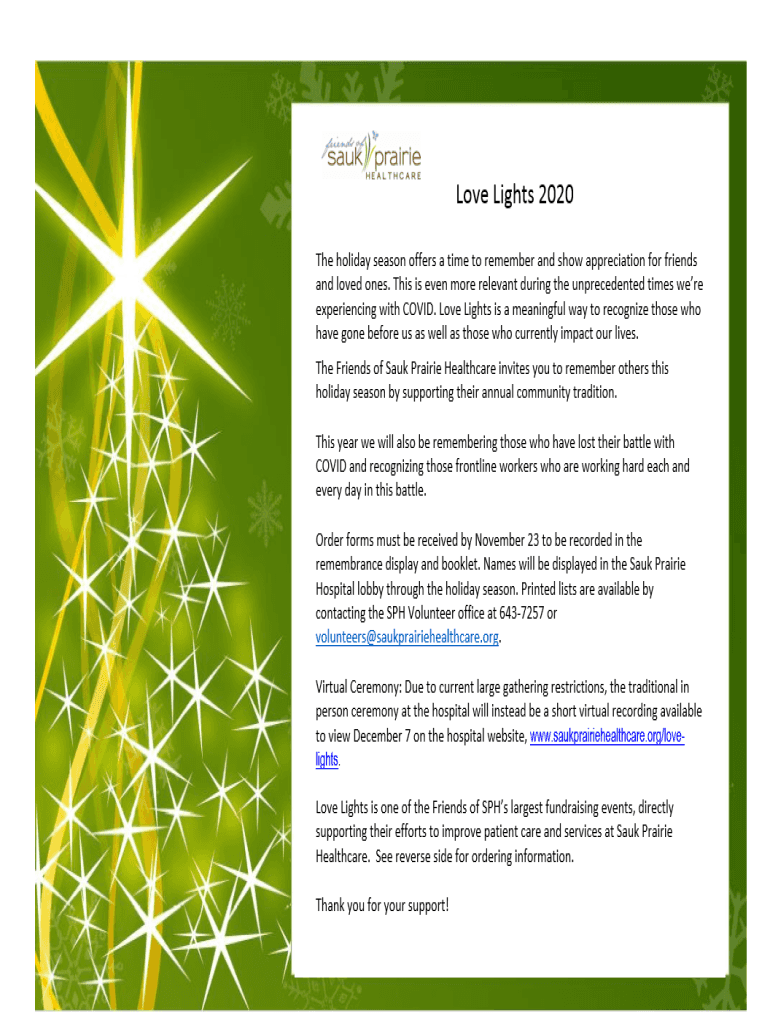 Deadline for recognition in the Love Light remembrance display and booklet is November 23. Please send your form and payment to: Love Lights Friends of SPH 260 26th Street Prairie du Sac, WI 53578Donor