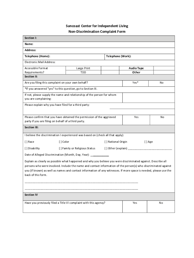 Sun coast Center for Independent Living Nondiscrimination Complaint Form Section I: Name: Address: Telephone (Home):Telephone (Work):Electronic Mail Address: Accessible Format Requirements? Section
