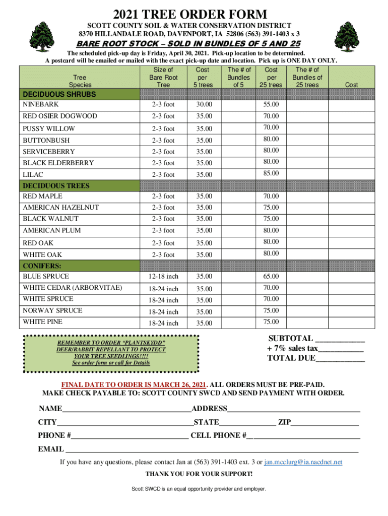 2021 TREE ORDER FORM SCOTT COUNTY SOIL & WATER CONSERVATION DISTRICT 8370 HALLANDALE ROAD, DAVENPORT, IA 52806 (563) 3911403 x 3BARE ROOT STOCK SOLD IN BUNDLES OF 5 AND 25 The scheduled pickup day