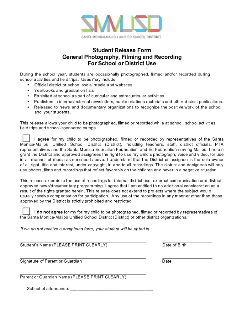 Student Release Form General Photography, Filming and Recording For School or District Use During the school year, students are occasionally photographed, filmed and/or recorded during school activities