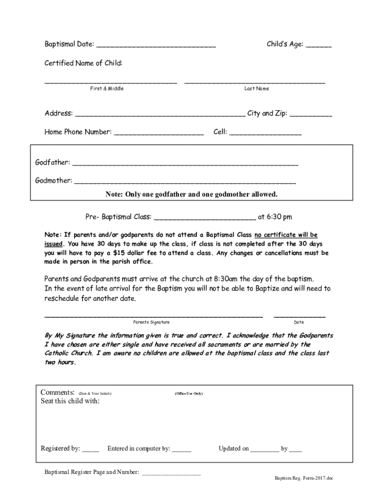 Baptismal Date: Child's Age: Certified Name of Child: First & Middle Last Headdress: City and Zip: Home Phone Number: Cell: Godfather: Godmother: Note: Only one godfather and one godmother allowed.