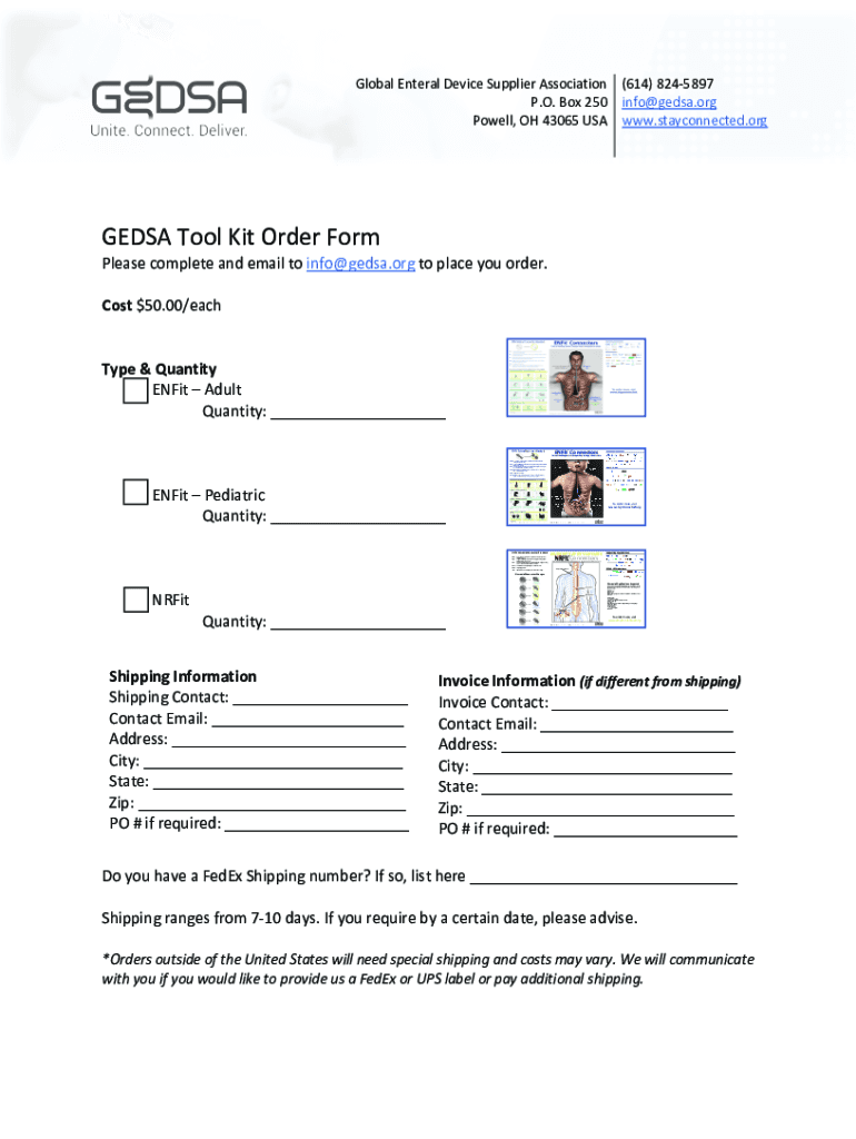 Global Enteral Device Supplier Association P.O. Box 250 Powell, OH 43065 USA(614) 8245897 info media.org www.stayconnected.orgGEDSA Tool Kit Order Form Please complete and email to info media.org