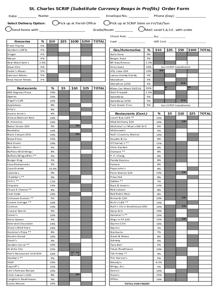 St. Charles SCRIP (Substitute Currency Reaps in Profits) Order Form Date: Name: Select Delivery Option:Pick up at Parish Office Send home with Envelope No. Phone (Day): Pick up at SCRIP Sales on Fri/Sat/Upgrade/Room