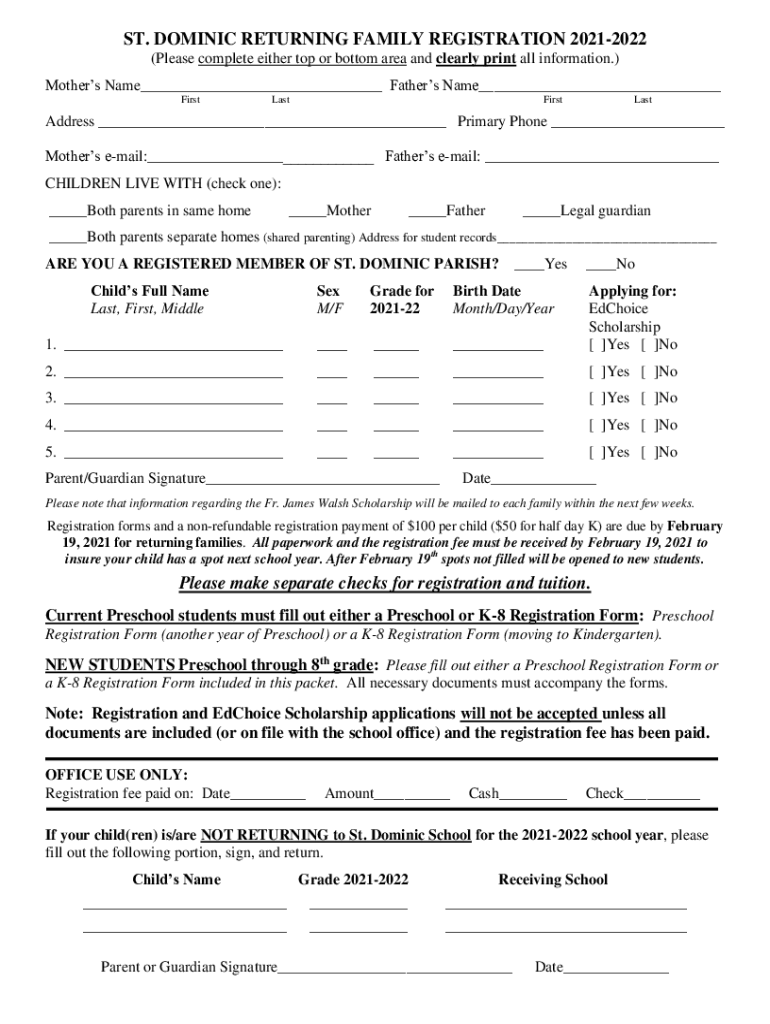 ST. DOMINIC RETURNING FAMILY REGISTRATION 20212022 (Please complete either top or bottom area and clearly print all information.) Mothers Name Fathers Name FirstLastFirstLastAddress Primary Phone