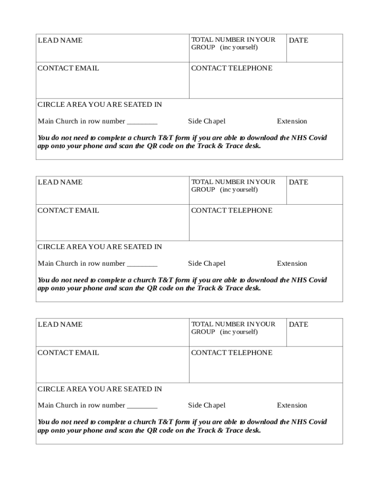 LEAD TEETOTAL NUMBER IN YOUR GROUP (inc yourself)CONTACT EMAILCONTACT TELEPHONEDATECIRCLE AREA YOU ARE SEATED IN Main Church in row number Side ChapelExtensionYou do not need to complete a church