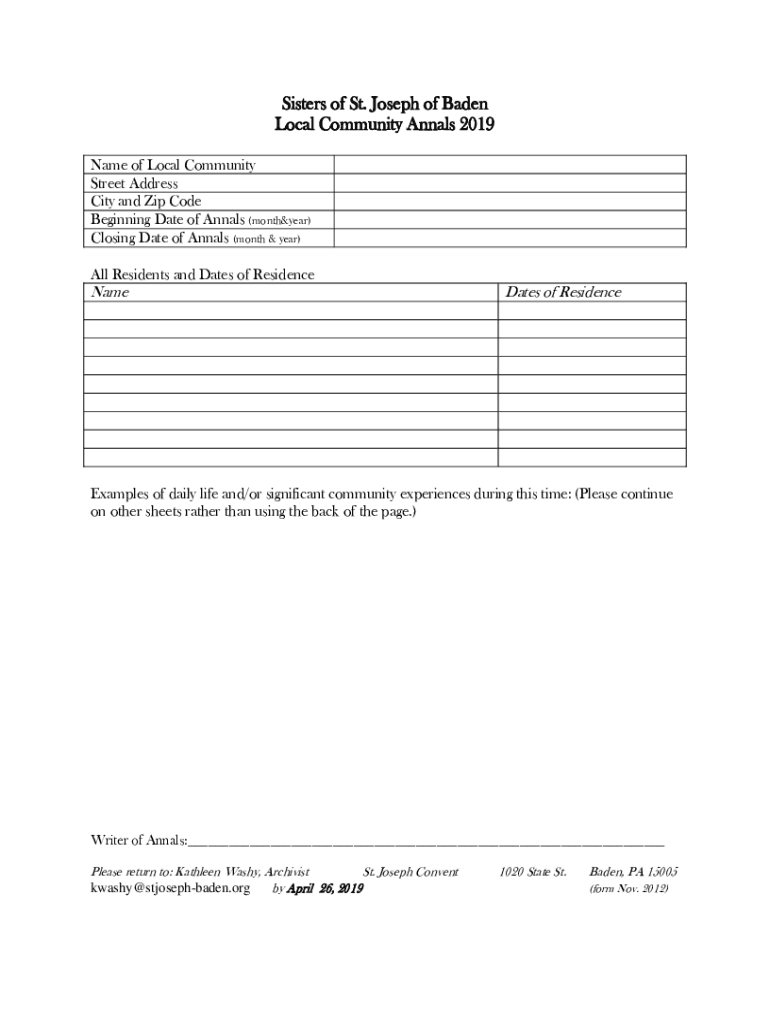 Sisters of St. Joseph of Baden Local Community Annals 2019 Name of Local Community Street Address City and Zip Code Beginning Date of Annals (Montpelier) Closing Date of Annals (month & year) All