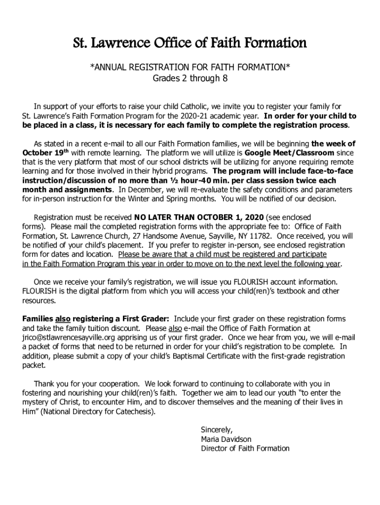 *ANNUAL REGISTRATION FOR FAITH FORMATION*