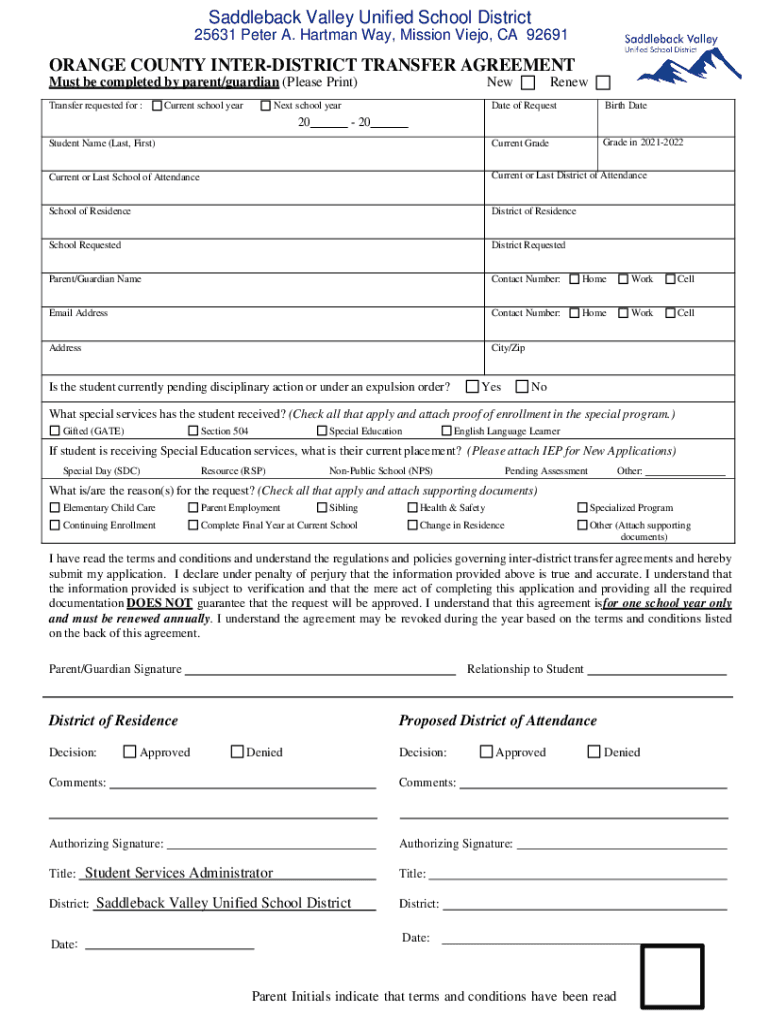 25631 Peter A. Hartman Way, Mission Viejo, CA 92691ORANGE COUNTY INTERDISTRICT TRANSFER AGREEMENT
