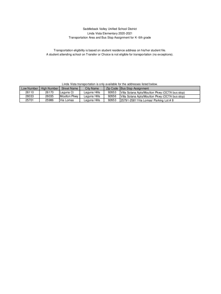 Transportation Area and Bus Stop Assignment for K 6th gradeTransportation eligibility is based on student residence address