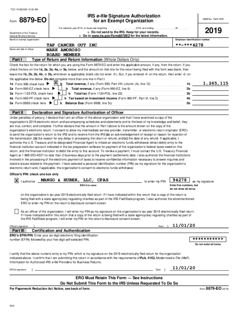for an Exempt Organization8879EOOMB No. 15451878For calendar year 2019, or fiscal year beginning. . . . . . . . . . . . . . . . . . . .