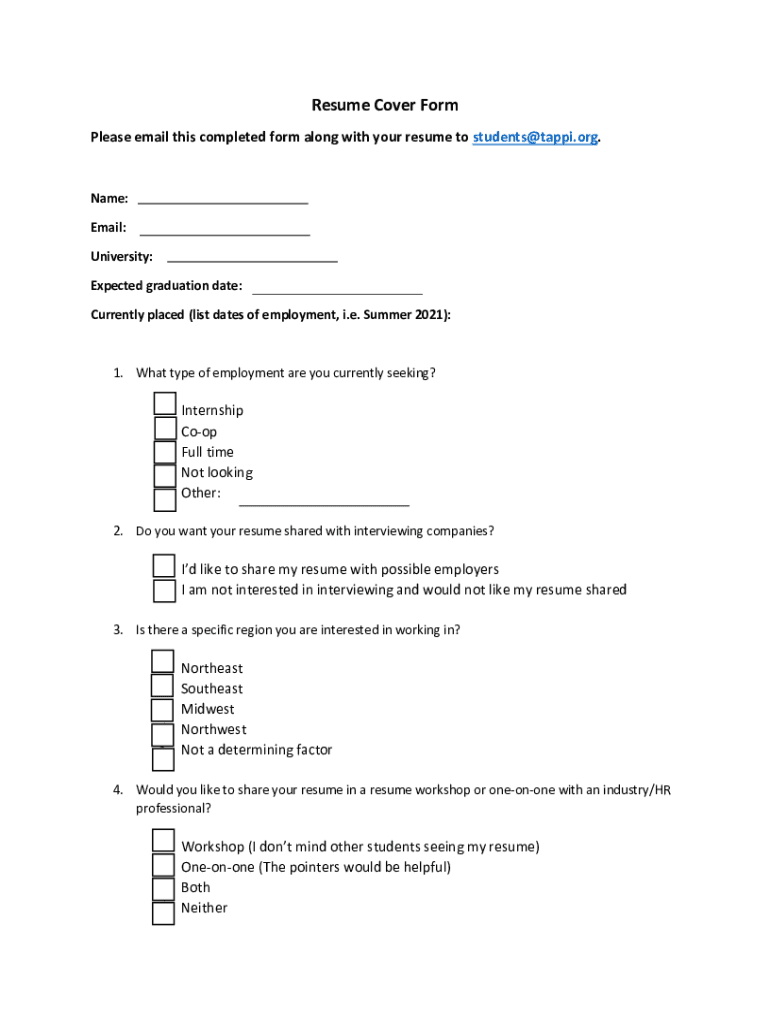 ResumeCoverForm Pleaseemailthiscompletedformalongwithyourresumetostudents TAPI.org. Name: Email: University: Expectedgraduationdate: Currently placed(listdatesofemployment, i.e. Summer2021): 1. Whattypeofemploymentareyoucurrentlyseeking?