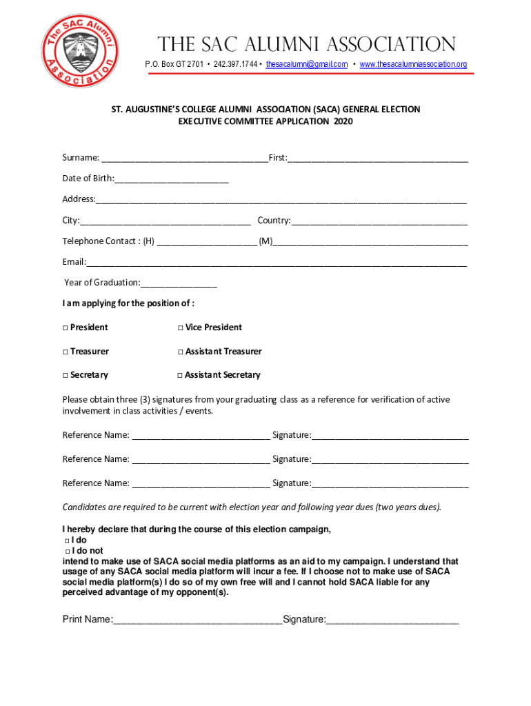 THE SAC Alumni Association P.O. Box GT 2701 242.397.1744 thesacalumni gmail.com www.thesacalumniassociation.orgST. AUGUSTINE COLLEGE ALUMNI ASSOCIATION (SACK) GENERAL ELECTION EXECUTIVE COMMITTEE