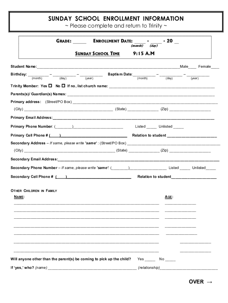 SUNDAY SCHOOL ENROLLMENT INFORMATION Please complete and return to Trinity GRADE: ENROLLMENT DATE: 20 (month)SUNDAY SCHOOL TIME(day)9:15 A. Student Name: Male Female Birthday: (month)(day)(year)Baptism