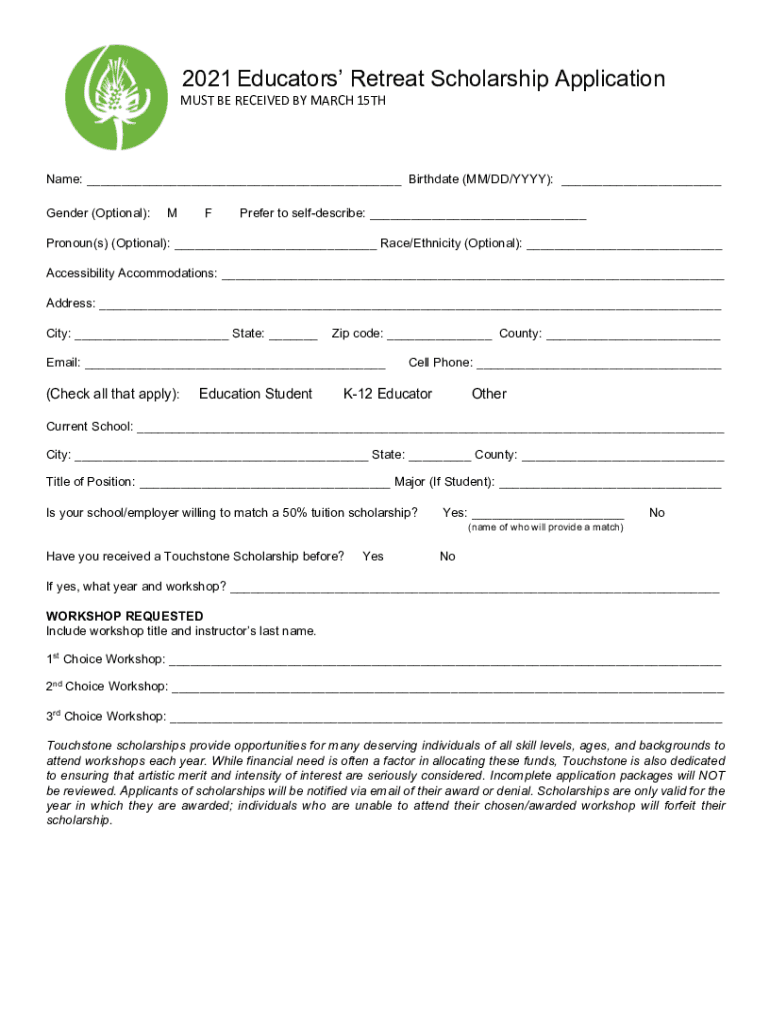 2021 Educators Retreat Scholarship Application MUST BE RECEIVED BY MARCH 15THName: Birthdate (MM/DD/YYY): Gender (Optional):MFP refer to self describe: Pronoun(s) (Optional): Race/Ethnicity (Optional):