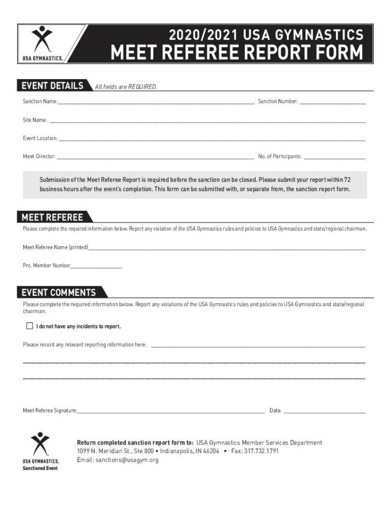 2020/2021 USA GYMNASTICSMEET REFEREE REPORT FORM EVENT Details fields are REQUIRED. Sanction Name: Sanction Number: Site Name: Event Location: Meet Director: No. of Participants: Submission of the