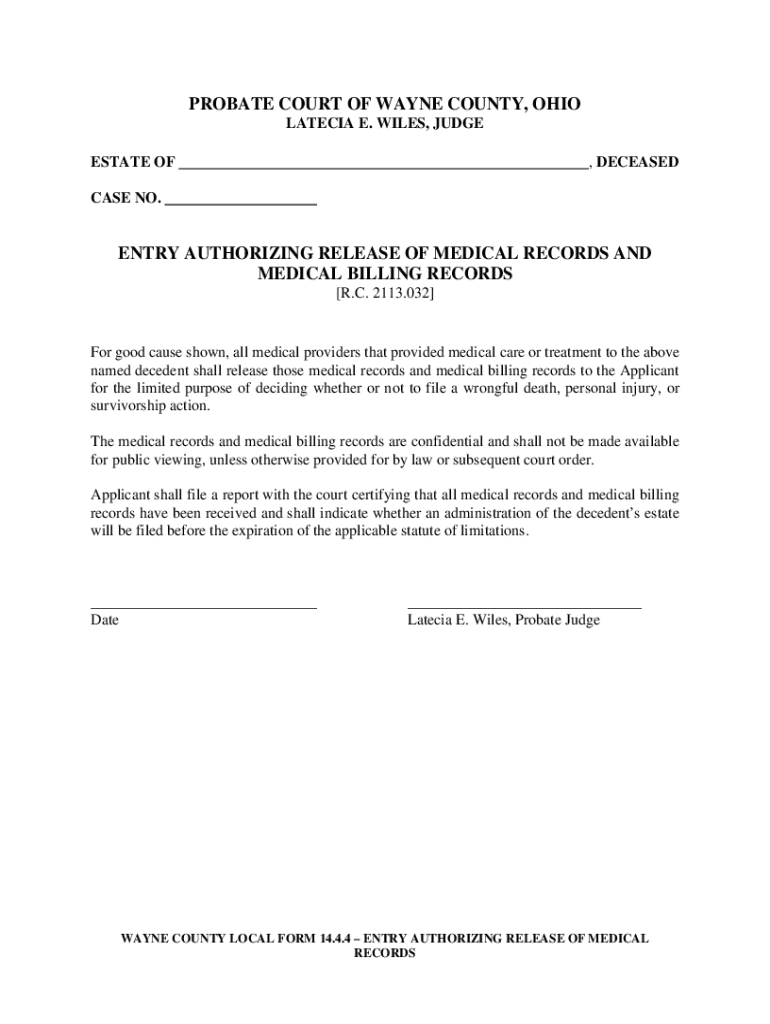 PROBATE COURT OF WAYNE COUNTY, OHIO LATE CIA E. WILES, JUDGE ESTATE OF, DECEASED CASE NO.ENTRY AUTHORIZING RELEASE OF MEDICAL RECORDS AND MEDICAL BILLING RECORDS R.C. 2113.032 For good cause shown,