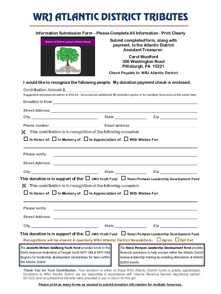 WRJ Atlantic District Tributes can typically be filled out online through the organization's website or submitted via mail with a physical form.