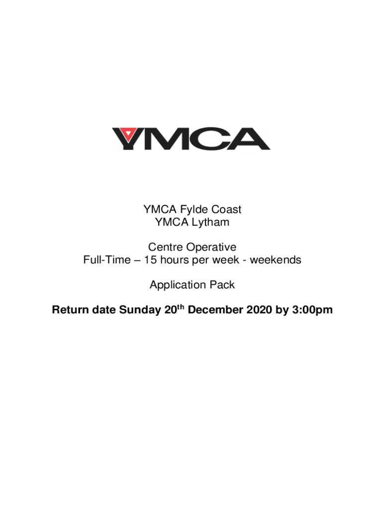 YMCA File Coast YMCA Latham Center Operative Halftime 15 hours per week weekends Application Pack Return date Sunday 20th December 2020 by 3:00pmContentsA Welcome note to applicant3YMCA File Coasts