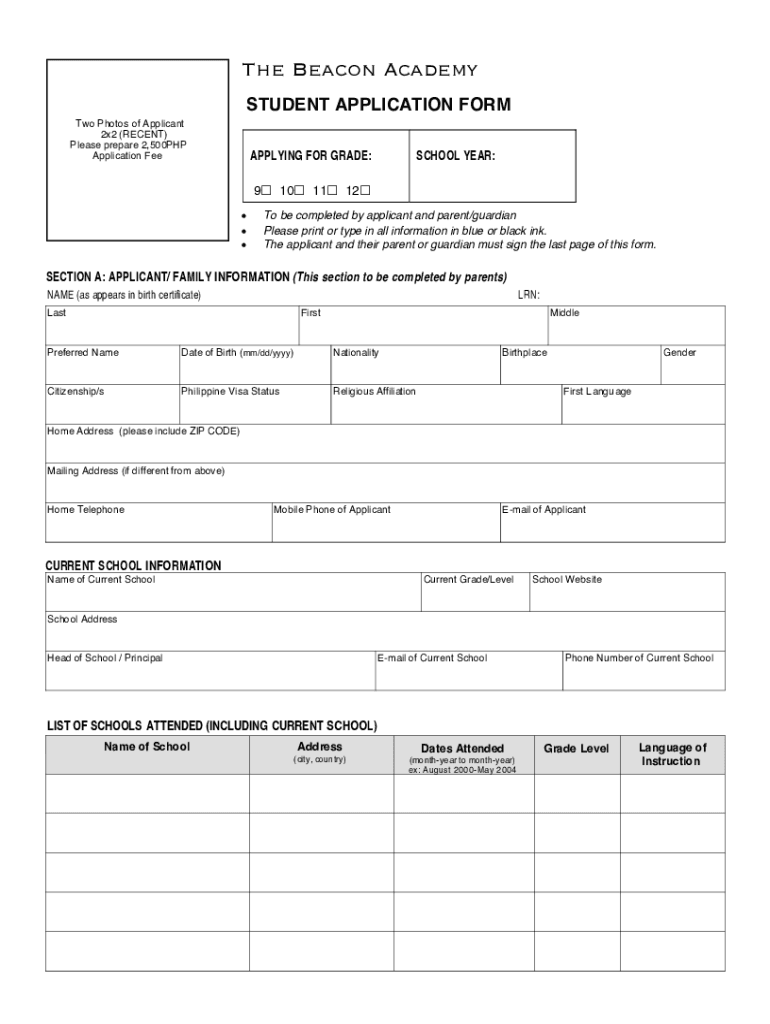 The Beacon Academy STUDENT APPLICATION FORM Two Photos of Applicant 2×2 (RECENT) Please prepare 2,500PHP Application Reapplying FOR GRADE:SCHOOL YEAR:9 10 11 12 To be completed by applicant and parent/guardian