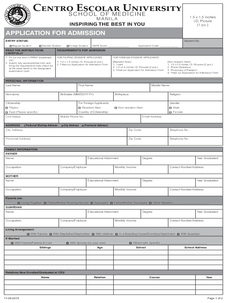 CentOS Escolar University POOL OF MEDICINE1.5 × 1.5 inches I.D. Picture (1 PC.)MANILAINSPIRING THE BEST IN APPLICATION FOR ADMISSION Student No. ENTRY STATUS: Regular Student Transfer Student Foreign