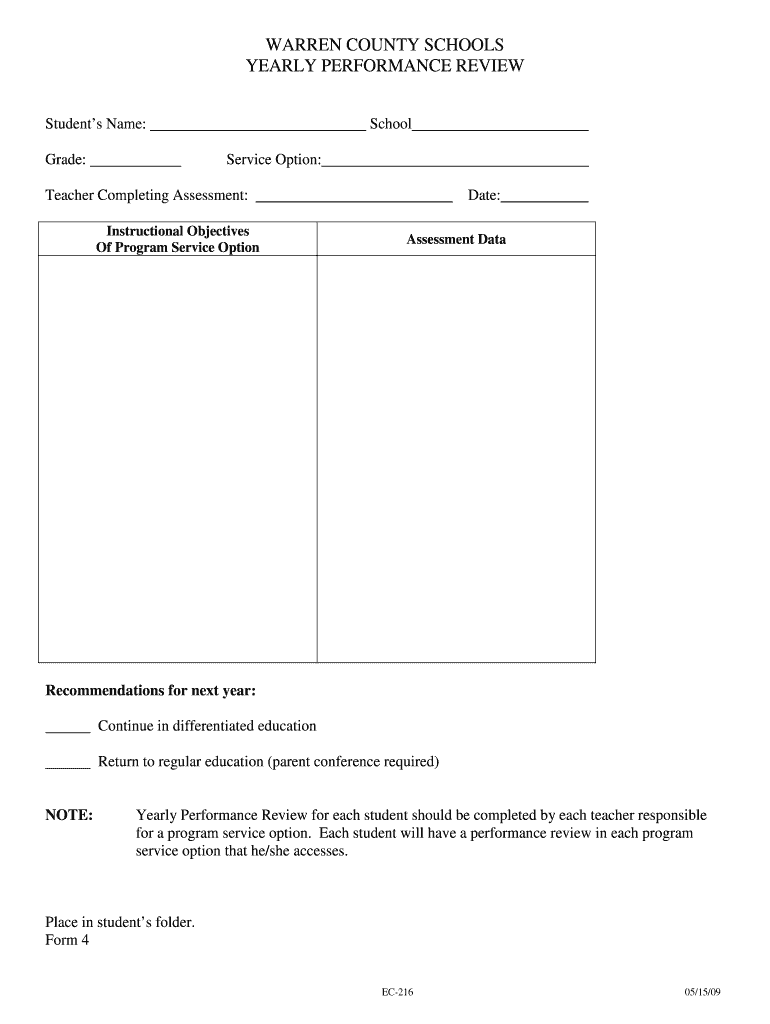 The Warren County Student Performance Review Form is a performance review document used by teachers to evaluate student performance in various educational programs.