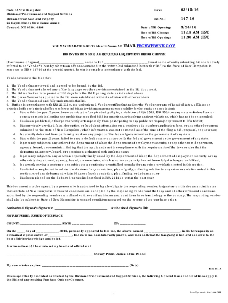 State of New Hampshire Division of Procurement and Support ServicesDate:03/15/16Bureau of Purchase and Property 25 Capitol Street, State House Annexed No.:14716Concord, NH 033016398Date of Bid Opening: