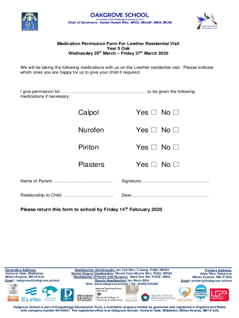 Get the free Year 5 Oak Lowther Medication consent form
