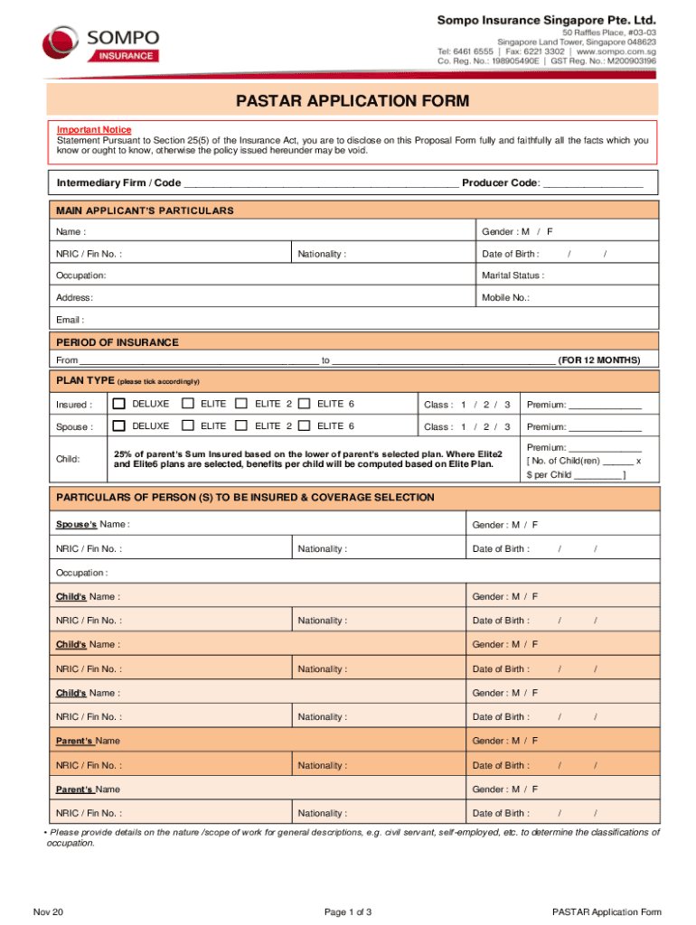 PASTOR APPLICATION FORM Important Notice Statement Pursuant to Section 25(5) of the Insurance Act, you are to disclose on this Proposal Form fully and faithfully all the facts which you know or ought
