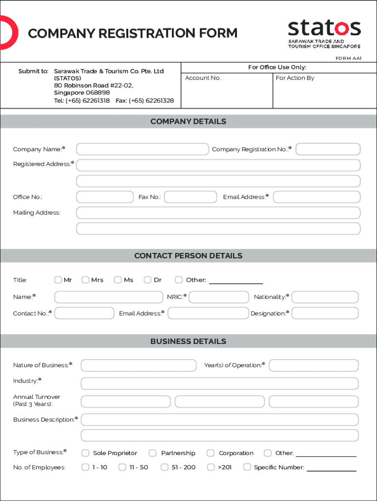 COMPANY REGISTRATION FORM A A1Submit to: Sarawak Trade & Tourism Co. PTE. Ltd (STATES) 80 Robinson Road #2202, Singapore 068898 Tel: (+65) 62261318 Fax: (+65) 62261328For One Use Only: Account No.
