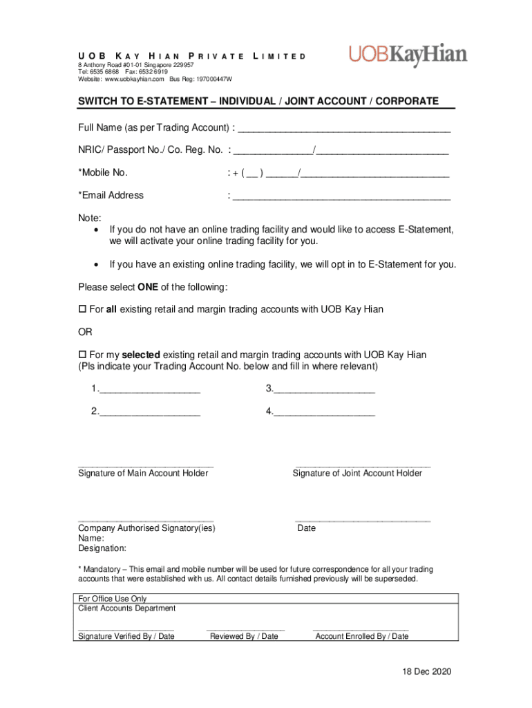 U O BK A OH I Am NP R I V A T EL I M I T E D8 Anthony Road #0101 Singapore 229957 Tel: 6535 6868 Fax: 6532 6919 Website: www.uobkayhian.com Bus Reg: 197000447WSWITCH TO STATEMENT INDIVIDUAL / JOINT