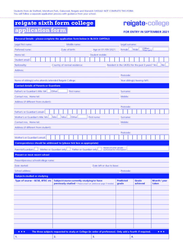 Students from de Stafford, Martha Park, Oak wood, Rate and Warwick SHOULD NOT COMPLETE THIS FORM. You will follow a separate application process with guidance from your school. Rate sixth form college