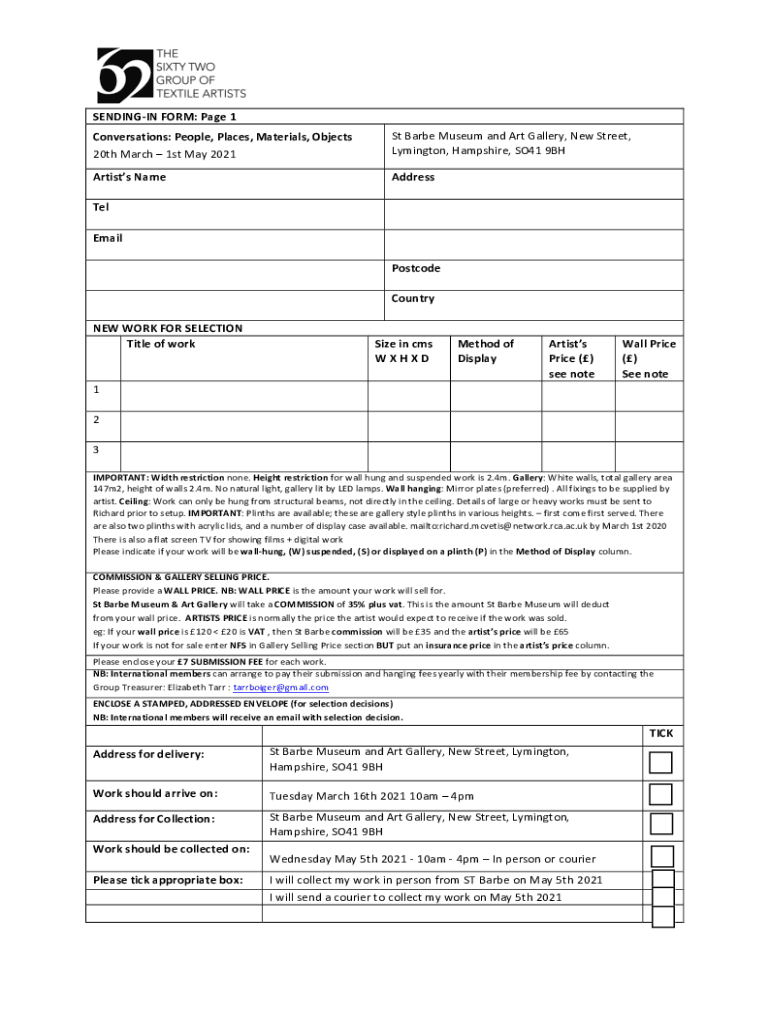 SENDING IN FORM: Page 1Conversations: People, Places, Materials, Objects20th March 1st May 2021St Bare Museum and Art Gallery, New Street, Lexington, Hampshire, SO41 9BHArtists NameAddressTelEmailPostcodeCountryNEW