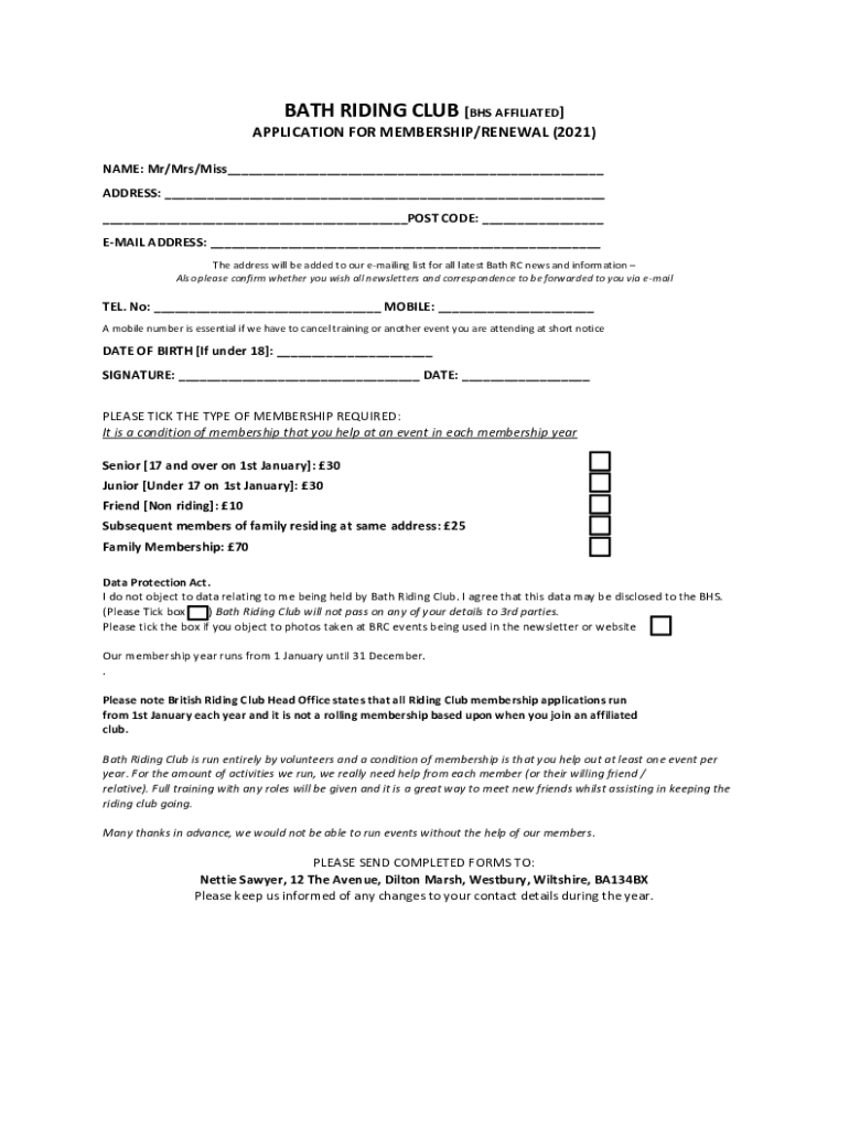 BATH RIDING CLUB BHS AFFILIATED APPLICATION FOR MEMBERSHIP/RENEWAL (2021) NAME: Mr/Mrs/Miss ADDRESS: POST CODE: EMAIL ADDRESS: The address will be added to our emailing list for all latest Bath RC