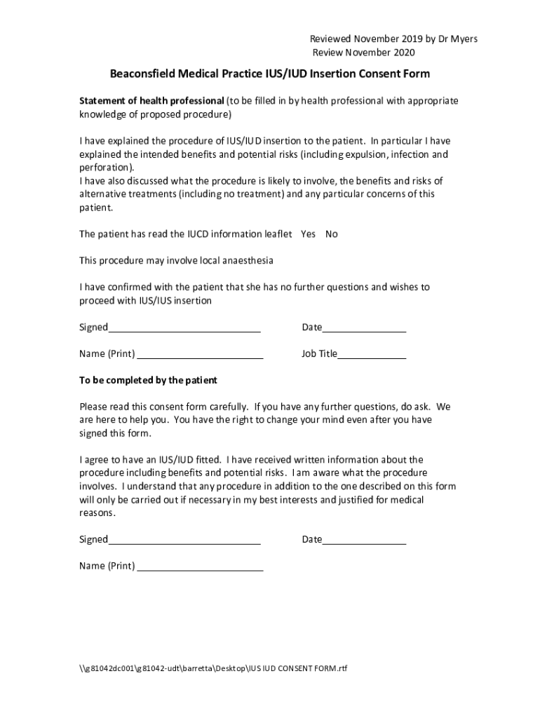Get the free Beaconsfield Medical Practice IUS/IUD Insertion Consent Form - beaconsfieldmedicalpr...