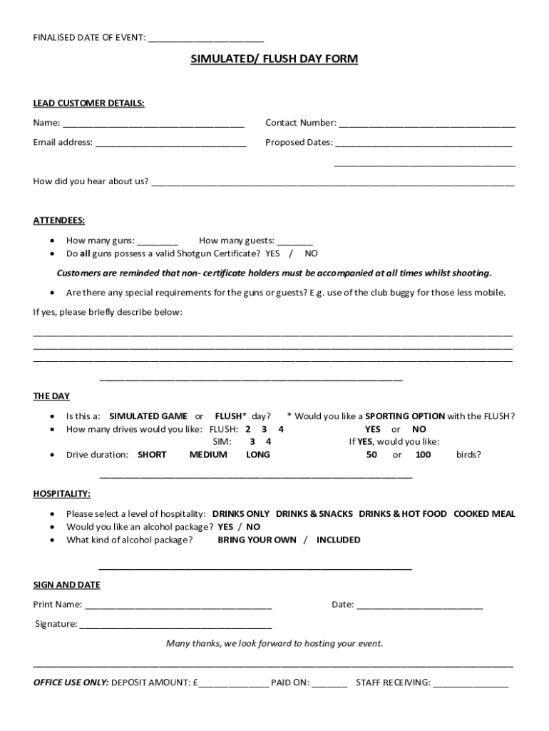 Finalized DATE OF EVENT: SIMULATED/ FLUSH DAY FORMED CUSTOMER DETAILS: Name: Contact Number: Email address: Proposed Dates: How did you hear about us? ATTENDEES: How many guns: How many guests: Do