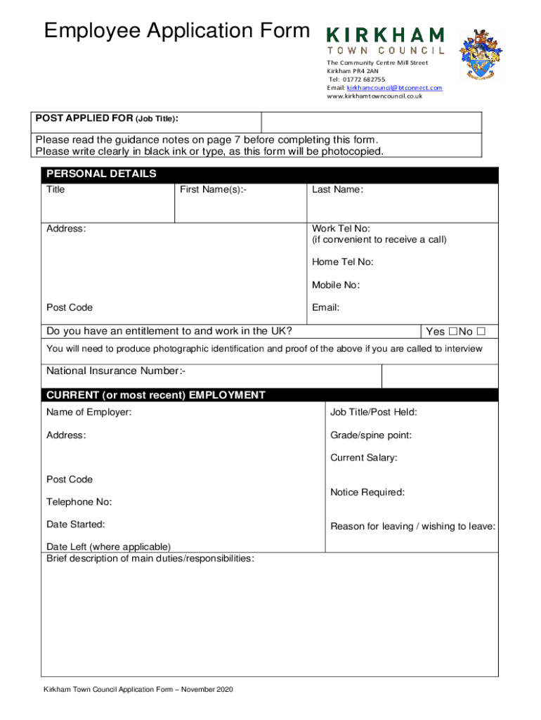 Get the free Employee Application Form - KIRKHAM TOWN COUNCIL