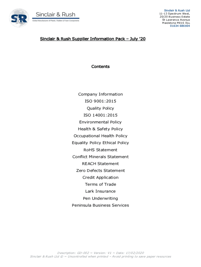 Sinclair & Rush Ltd 1113 Spectrum West, 20/20 Business Estate St Lawrence Avenue Maidstone ME16 0LL 01634 686504Sinclair & Rush Supplier Information Pack July '20ContentsCompany Information ISO 9001:2015