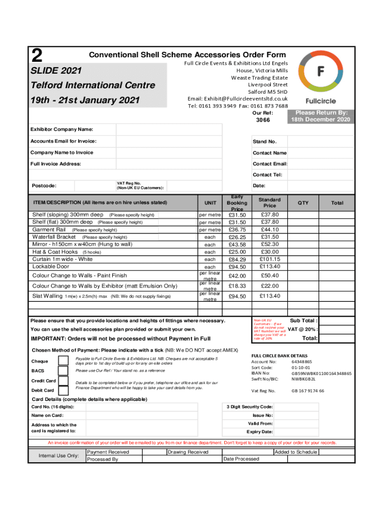 2Conventional Shell Scheme Accessories Order Form Full Circle Events & Exhibitions Ltd Engels House, Victoria Mills Waste Trading Estate Liverpool Street Salford M5 5HD Email: Exhibit Fullcircleeventsltd.co.UK