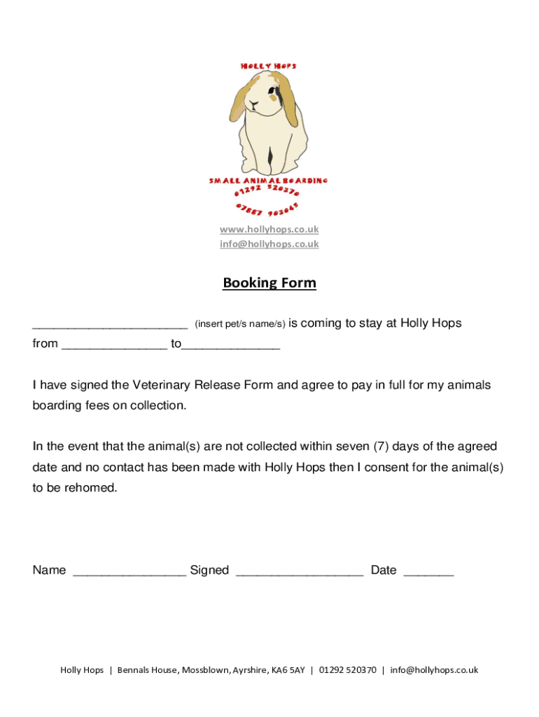 WWW.holly hops.co.UK info holly hops.co.booking Form (insert pet/s name/s) incoming to stay at Holly Hops from to I have signed the Veterinary Release Form and agree to pay in full for my animals