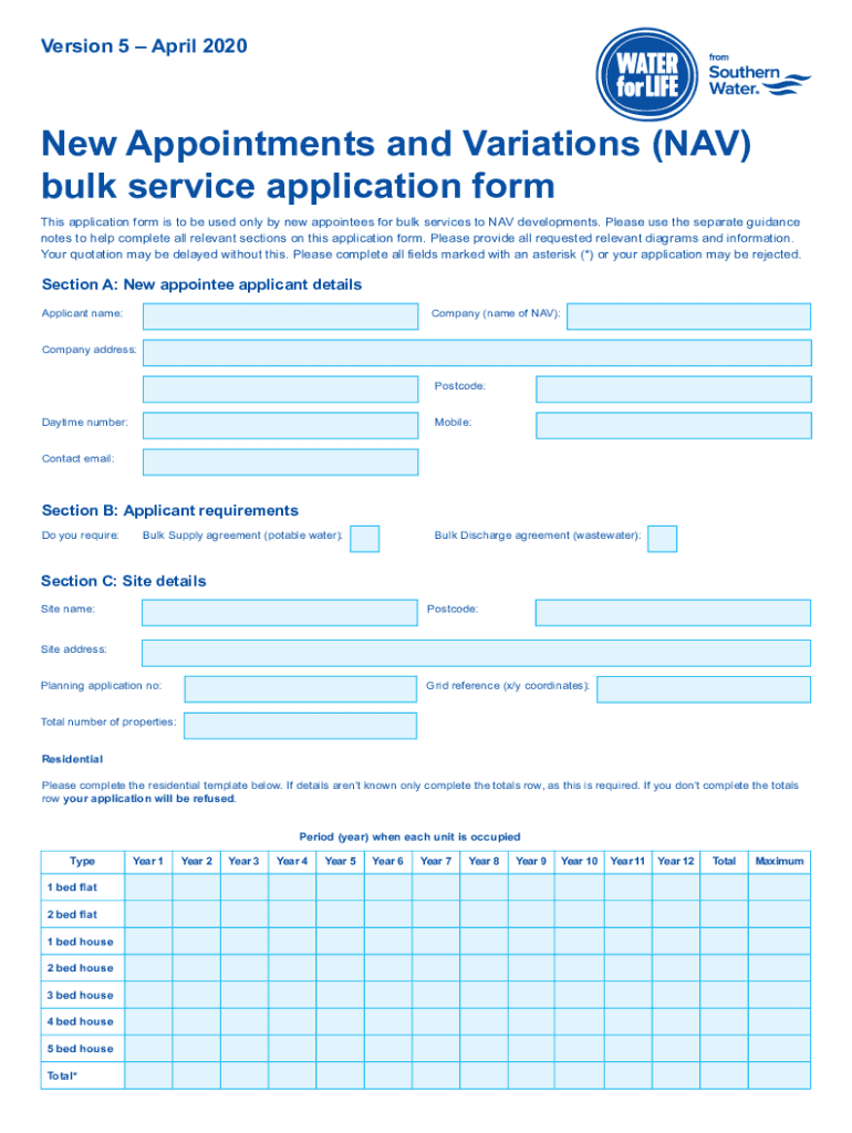 Version 5 April 2020New Appointments and Variations (NAV) bulk service application form This application form is to be used only by new appointees for bulk services to NAV developments. Please use