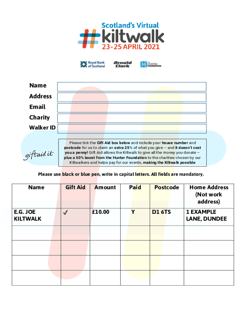 Name Address Email Charity Walker ID Please tick the Gift Aid box below and include your house number and postcode for us to claim an extra 25% of what you give, and it doesn't cost you a penny! Gift