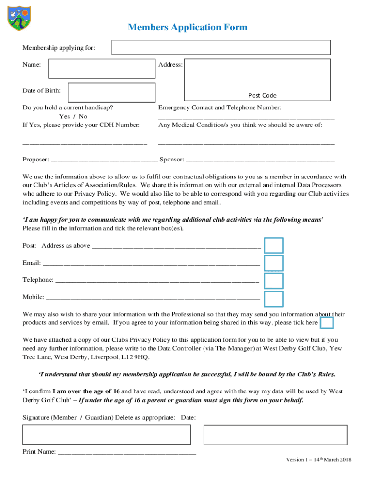 Members Application Form Membership applying for: Name:Address:Date of Birth:Post Coded you hold a current handicap? Yes / No If Yes, please provide your CDH Number:Emergency Contact and Telephone