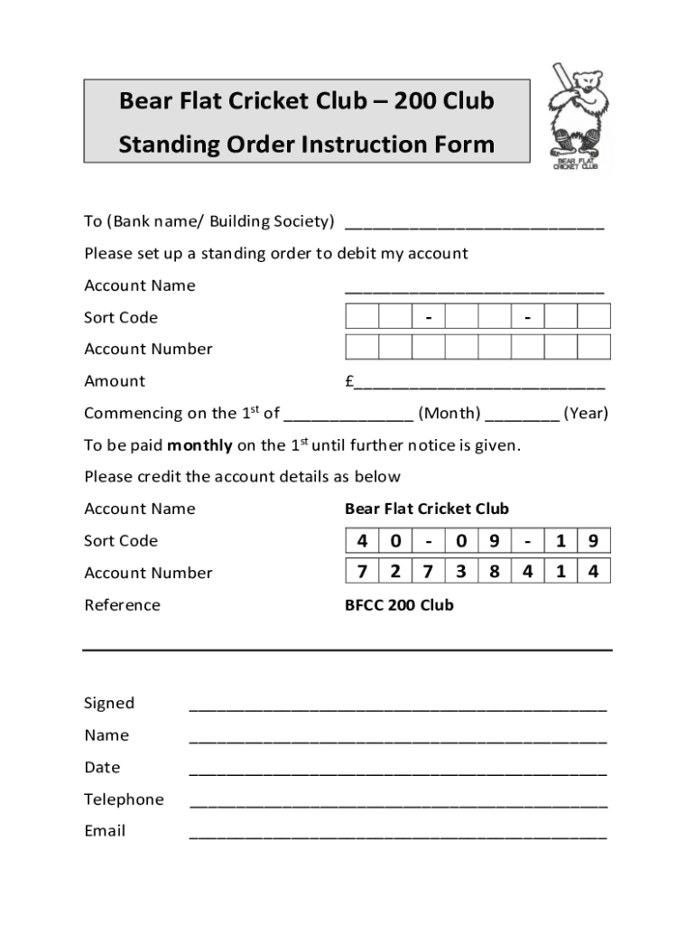 Bear Flat Cricket Club 200 Club Standing Order Instruction Form To (Bank name/ Building Society) Please set up a standing order to debit my account Name Sort CodeAccount Number Amount Commencing on