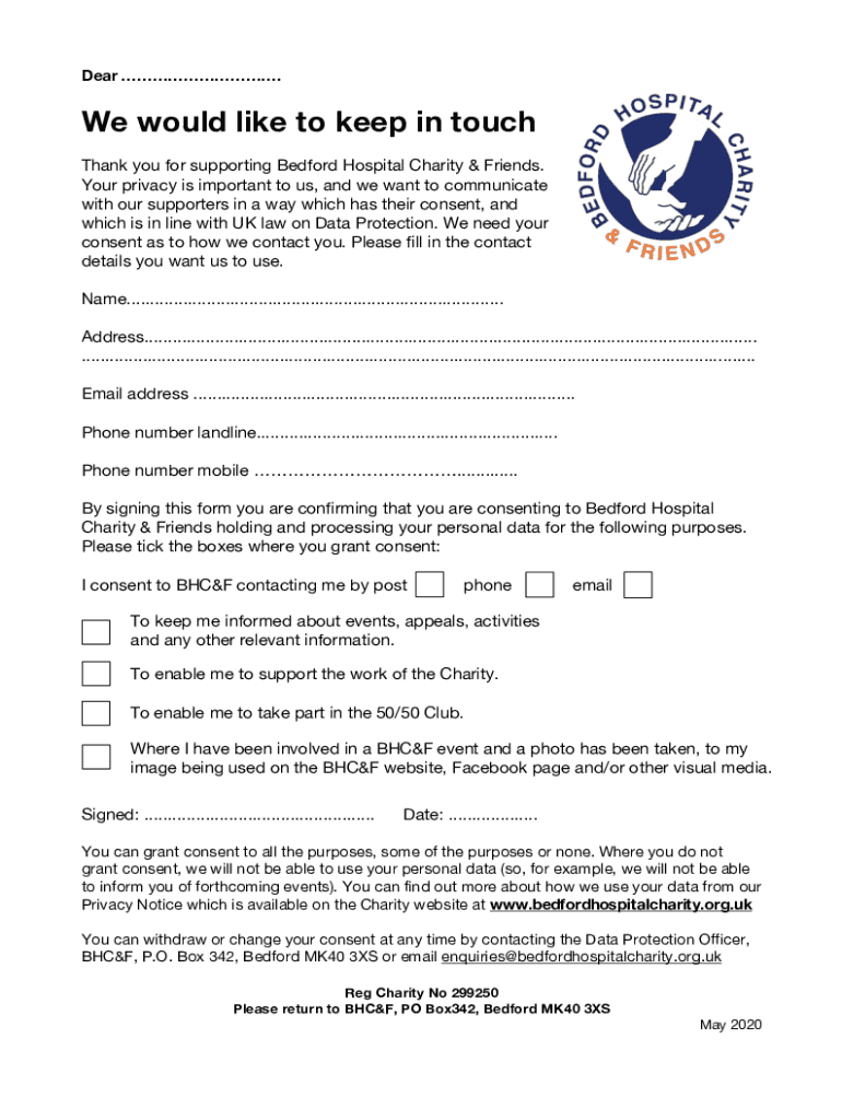 Dear. We would like to keep in touch Thank you for supporting Bedford Hospital Charity & Friends. Your privacy is important to us, and we want to communicate with our supporters in a way which has